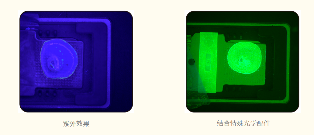 膠水檢測也多采用2D面陣成像,但膠水表面是透明無色光滑的,使用常規(guī)光源方案不一定有好的效果;這時我們可以使用紫外光源,使膠水輪廓突出。