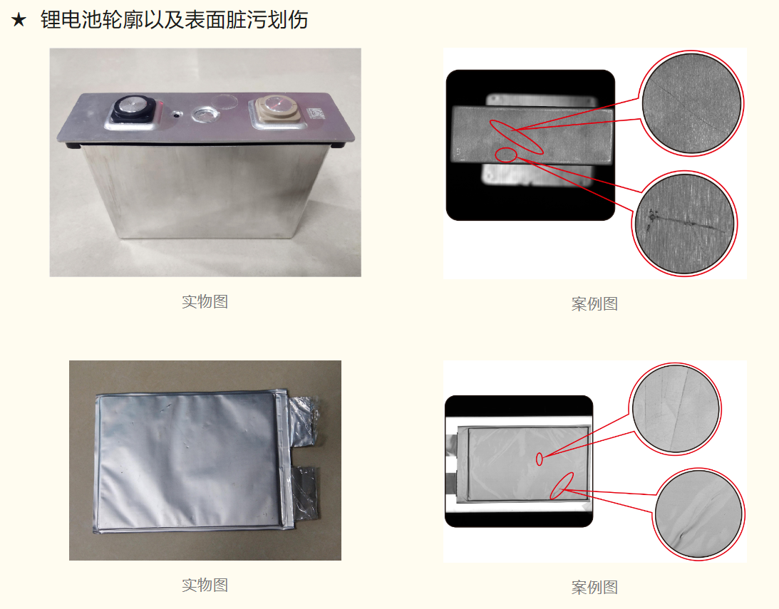 鋰電池會封裝成一個電池包,它的外觀檢測也要求非常嚴謹。在生產(chǎn)中,封包主要為機器操作,常見的刮花、壓傷與臟污等問題,大部分是機器生產(chǎn)時造成的。