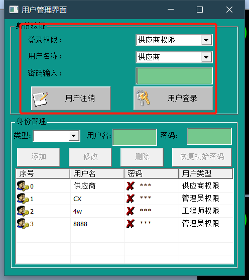 在用戶登錄界面進行登錄,選擇“登錄權(quán)限”“用戶名稱”輸入密碼(供應(yīng)商密碼:310525),后點擊用戶登錄