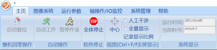 軟件主頁包括啟動復(fù)位,自動工作,暫停作業(yè)和全體停止按鈕。