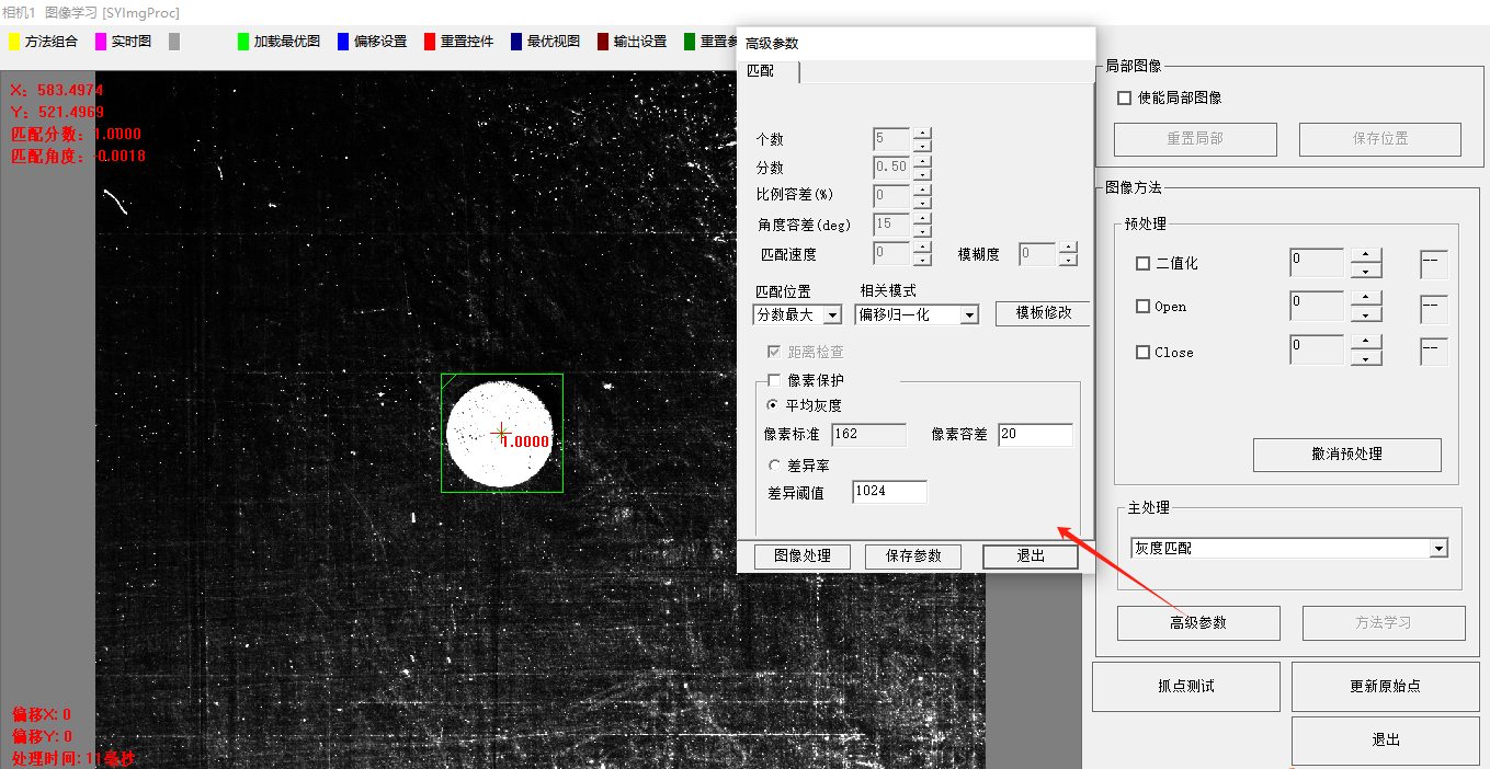 4、調(diào)整高級參數(shù)。點擊“高級參數(shù)”,進入高級參數(shù)界面,調(diào)整參數(shù)可根據(jù)實際情況修改“分數(shù)”、“個數(shù)”、“比例容差”、“角度容差”、“匹配速度”、“模糊度”等參數(shù)。