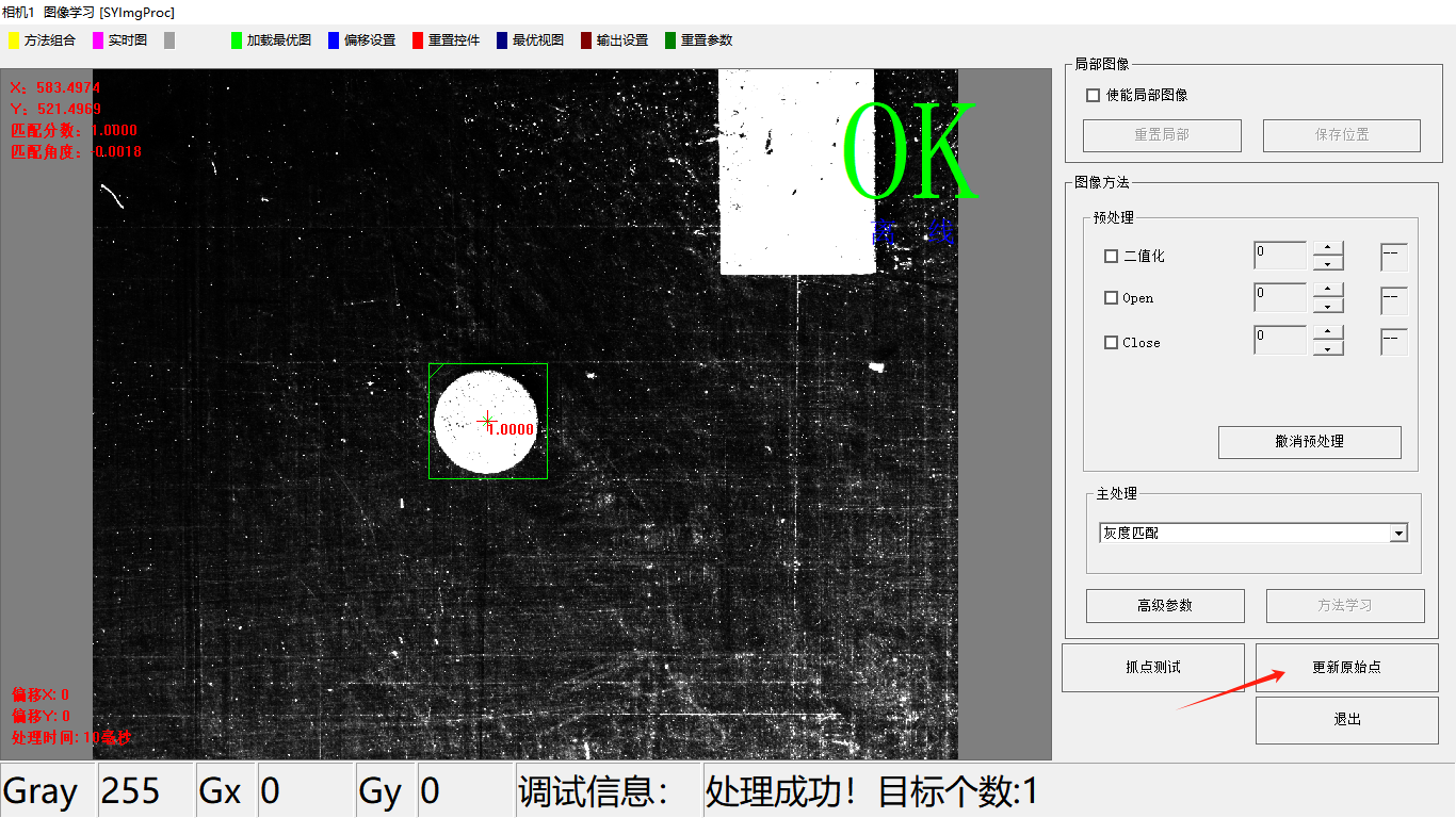 2、下拉重新選擇“灰度匹配”,黃色的模板框工具則會顯示出來,調(diào)整模板框位置和大小到合適,再點擊“方法學(xué)習(xí)”,則學(xué)習(xí)記錄當前的模板。