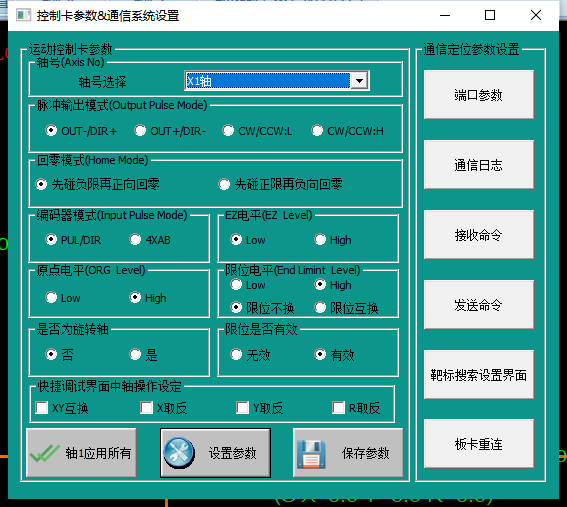 板卡和通信參數(shù)包括UVW平臺各軸的參數(shù)如脈沖輸出模式、回零模式、編碼器模式、EZ電平、原點電平、限位電平等操作。