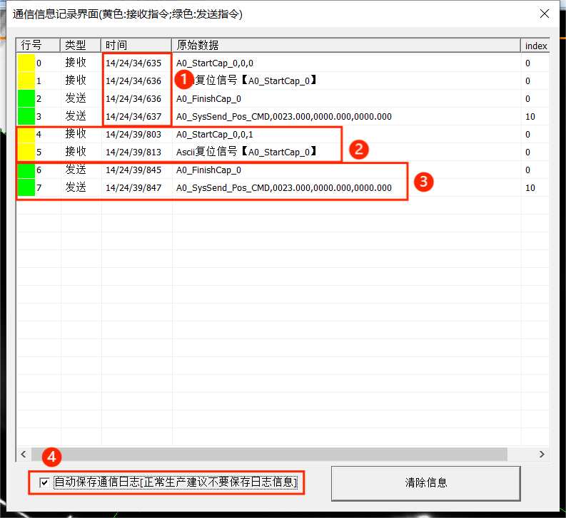 ①是一個流程的運行時間,由機器人發(fā)信號到視覺返回信號為一個通訊流程,時間是由時、分、秒、毫秒組成,例如圖中14/24/34/635 就是14時24分34秒635毫秒