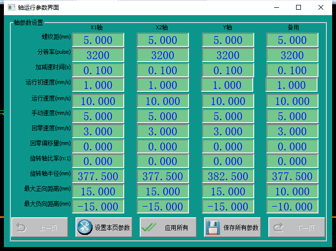 軸參數(shù)設(shè)置UVW平臺各軸的螺紋距、分辨率、加減速時間、運行初速度、運行速度、手動速度、回零速度、回零偏移量、旋轉(zhuǎn)軸比率、旋轉(zhuǎn)軸半徑、最大正向距離、最大負向距離等參數(shù)。