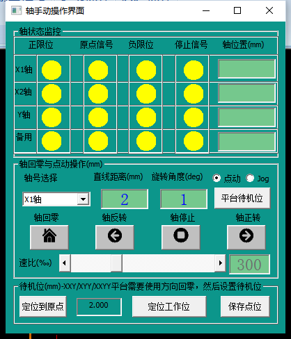 軸回零與點動操作:選擇軸號,單軸回零,軸正反轉(zhuǎn),點動操作。