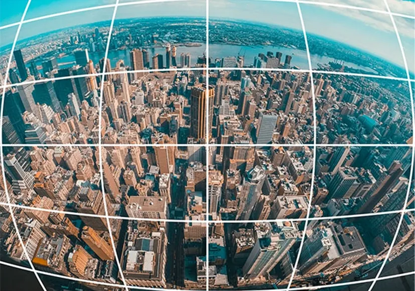 桶形失真(又稱桶形畸變)的圖像邊緣和側(cè)面遠(yuǎn)離中心彎曲。這在視覺上看起來像是圖像中心外凸,因?yàn)樗东@到了彎曲視野(FoV)的外觀。例如,當(dāng)在高層建筑的高處使用較短焦距的鏡頭(又稱“廣角鏡頭”)時(shí),可以捕獲更寬的FoV。當(dāng)使用產(chǎn)生極度扭曲和寬FoV的魚眼鏡頭時(shí),F(xiàn)oV會(huì)實(shí)現(xiàn)最夸張的效果,如圖5所示。在這張圖像中,網(wǎng)格線用于幫助說明失真效果如何使圖像向靠近側(cè)面和邊緣的地方拉伸。