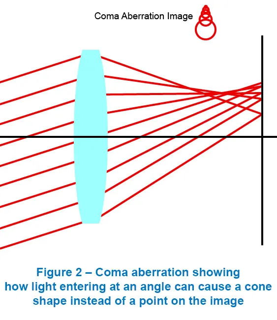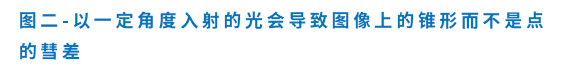 以一定角度進(jìn)入鏡頭的光線會(huì)導(dǎo)致光線在圖像平面上形成不斷擴(kuò)大的彌散圓軌跡。如圖2所示,這可能會(huì)導(dǎo)致擴(kuò)大的光線軌跡影響任何試圖成像的點(diǎn)光源。在圖2頂部,彗差圖像可以看作是向下擴(kuò)大的彌散圓的點(diǎn)光源,形成一個(gè)錐形圖像。這通常是光學(xué)元件未對(duì)準(zhǔn)的結(jié)果。
