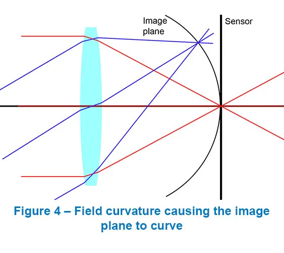 許多鏡頭都有圓形焦點(diǎn)場(chǎng)。這可能會(huì)導(dǎo)致圖像出現(xiàn)軟角,并主要使圖像中心處于聚焦位置。然而,大多數(shù)鏡頭都有些圓形的焦點(diǎn),如果不進(jìn)行裁剪,就無法聚焦整個(gè)圖像。因?yàn)榇蠖鄶?shù)鏡頭光學(xué)元件都有曲面。場(chǎng)曲是多個(gè)焦點(diǎn)導(dǎo)致圖像平面不平產(chǎn)生的結(jié)果。圖4顯示圖像平面為曲面,因?yàn)槊總€(gè)焦點(diǎn)都位于垂直于光軸的不同平面上。用一條線連接這些點(diǎn)時(shí),會(huì)顯示出一個(gè)曲面。光線離開光軸進(jìn)入鏡頭后,焦點(diǎn)并沒有聚焦在傳感器上。