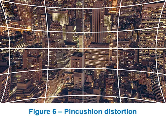 當(dāng)光線通過枕形失真(又稱枕形畸變)向光軸彎曲時(shí),圖像似乎向中間“收縮”。因此,圖像的邊緣和側(cè)面看起來會(huì)向圖像中心彎曲,如圖6所示,其中網(wǎng)格線越往中心彎曲,延伸越遠(yuǎn)。