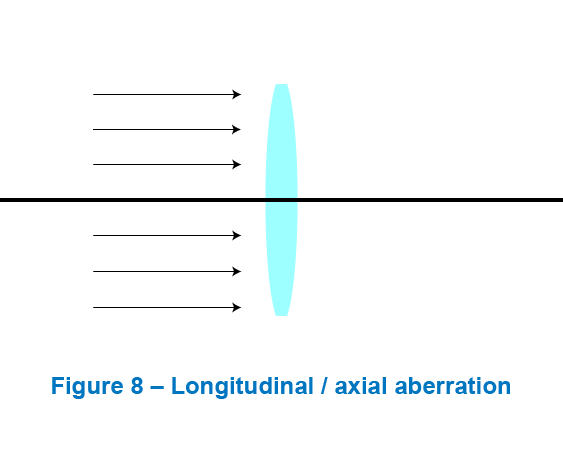 光的顏色代表一種特定波長(zhǎng)的光。彩色圖像將有多個(gè)波長(zhǎng)進(jìn)入鏡頭并由于折射而聚焦在不同的點(diǎn)??v向或軸向色差產(chǎn)生的原因是不同波長(zhǎng)光線沿光軸在不同點(diǎn)聚焦。波長(zhǎng)越短,其焦點(diǎn)就越靠近鏡頭,而波長(zhǎng)越長(zhǎng),則會(huì)發(fā)生相反情況,即焦點(diǎn)離鏡頭越遠(yuǎn),如圖8所示。采用更小的光圈,進(jìn)入鏡頭的光線可能仍會(huì)聚焦在不同的點(diǎn),但“彌散圓”的寬度(直徑)會(huì)大幅減小,避免圖像模糊嚴(yán)重。