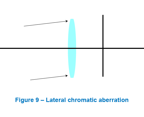 導(dǎo)致不同波長(zhǎng)沿圖像平面分布的離軸光為橫向或側(cè)向色差。這種像差會(huì)導(dǎo)致圖像主體邊緣形成彩色邊紋。校正難度比縱向色差更高。