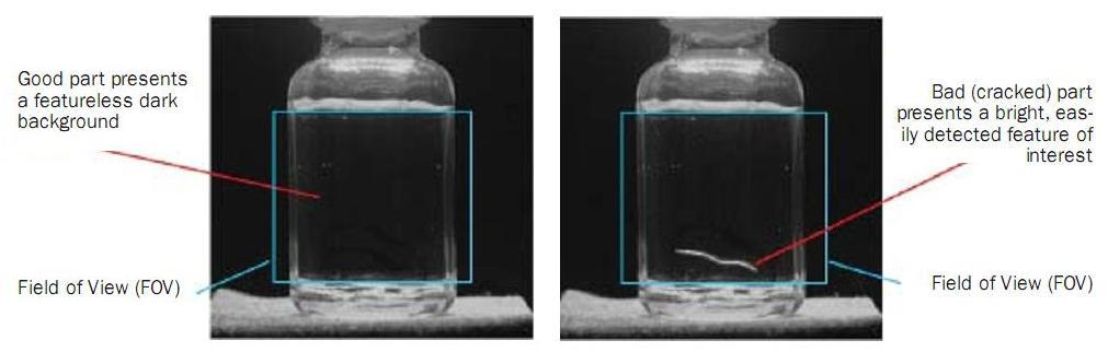 在這個(gè)應(yīng)用當(dāng)中,用暗場(chǎng)照明來創(chuàng)立一個(gè)明亮的,在暗背景下容易檢測(cè)的感興趣特征。在一個(gè)暗場(chǎng)區(qū)域中光線直接通過透明的瓶子。大多數(shù)穿透透明對(duì)象的光線不會(huì)被相機(jī)檢測(cè)到。如果材料不規(guī)則,比如有裂紋,一些光線就會(huì)凸顯出這個(gè)不規(guī)則。特別是劃痕創(chuàng)立了一個(gè)內(nèi)部空缺,這里光線折射和反射,以許多角度散射包括返回給相機(jī)。這些光線將很難檢測(cè)的劃痕轉(zhuǎn)換到暗背景下的亮特征。