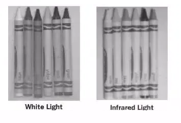 紅外光能用于在彩色對(duì)象之間消除灰度差別。暗對(duì)象吸收紅外波長(zhǎng),創(chuàng)造出一致性,而其它則呈現(xiàn)陰影。這個(gè)照明方案有利于檢測(cè)顏色或陰影變化的非一致性。