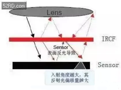 普通IR采用反射式,在可見(jiàn)光區(qū)域有較高透過(guò)率的同時(shí),存在較低的反射率,而在紅外區(qū)域正好相反,反射較高。所以,當(dāng)相機(jī)在成角度拍攝照片時(shí)紅外光在IR膜上會(huì)有較大反射,經(jīng)過(guò)光線多次反射后,會(huì)在照片上形成光暈現(xiàn)象。