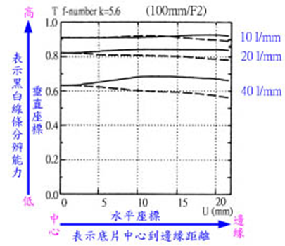 水平坐標表示底片中心到底片邊角的距離。由于鏡頭設計時其清晰呈像圖以須涵蓋全部的底片,而以底片對角線做為清晰呈像圖的直徑即可達到這個要求。在MTF圖中,取底片中心到對角線的路徑(亦是清晰呈像圖的半徑,在35mm規(guī)格的底片中長度大約是22mm)就足以表示出從底片中心到底片邊緣的解析力表現(xiàn)。
