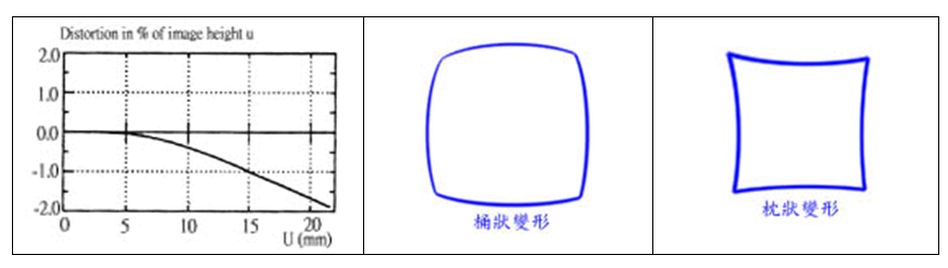 所有的鏡頭都存在有變形的現(xiàn)象。其中以直線線條最為明顯。實物中的直線,在經過鏡頭的呈像之后而顯得為彎曲,就是產生了變形,如果直線是朝內向底片中心(光軸)彎,一般稱之為枕狀變形。如果底片是朝外向底片邊緣彎曲,一般稱之為桶狀變形。在ZEISS所附變形率圖表中,水平坐標仍然代表著從底片中心到邊角的距離,垂直坐標則代表著變形率。變形率為”負”(曲線往下降)表產生桶狀變形。變形率為”正”(曲線往上揚)表示產枕狀變形?;旧献冃温试?-(坐標圖中垂直坐標為+、-、2.0)以內都是合乎標準。