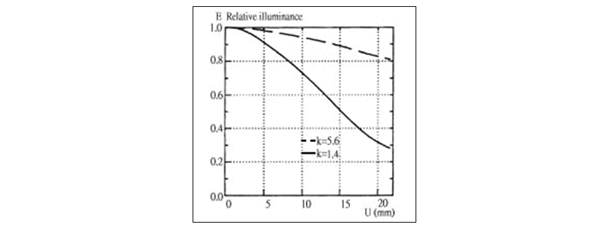 在透光率圖中,水平坐標代表從底片中心到邊角的距離。垂直坐標則代表著透光率高低。1.0表示在底片上所呈現(xiàn)的是100,透光(標準曝值),0.0表示完全不透光,0.6表示有60%的透光率。而在坐標中的虛線與實線,所代表的是不同光圈級數(shù)中所產生的透光率曲線。所有的鏡頭都會有不同程度的邊角失光現(xiàn)象,但是在經過放相成為照片之后,幾乎無法察覺這種失光現(xiàn)象,因為放大機的鏡頭也會有失光,所以在放相的過程中會形成一種互補的效應而消除了失光的現(xiàn)象。