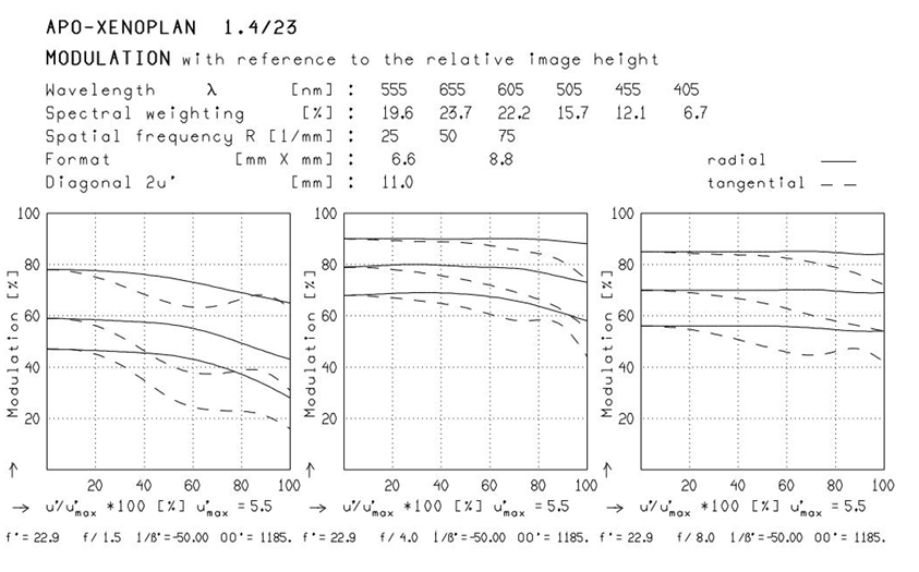 鏡頭APO-XENOPLAN1.4/23的MTF參數(shù)表如上圖所示,我們通過解讀MTF圖來了解這款鏡頭的特性。