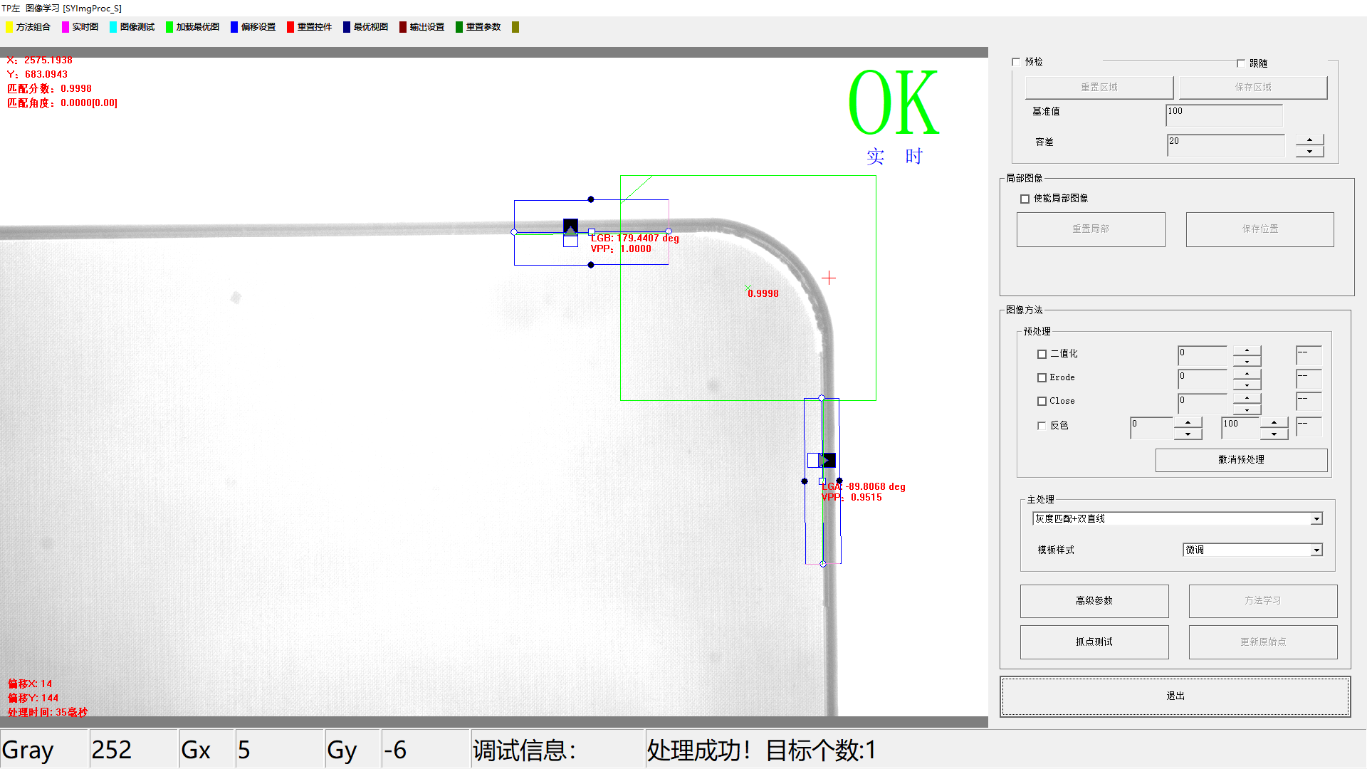 2、下拉重新選擇“灰度匹配+雙直線”,黃色的模板框工具則會(huì)顯示出來,調(diào)整模板框位置和大小到合適,再點(diǎn)擊“方法學(xué)習(xí)”,則學(xué)習(xí)記錄當(dāng)前的模板。
