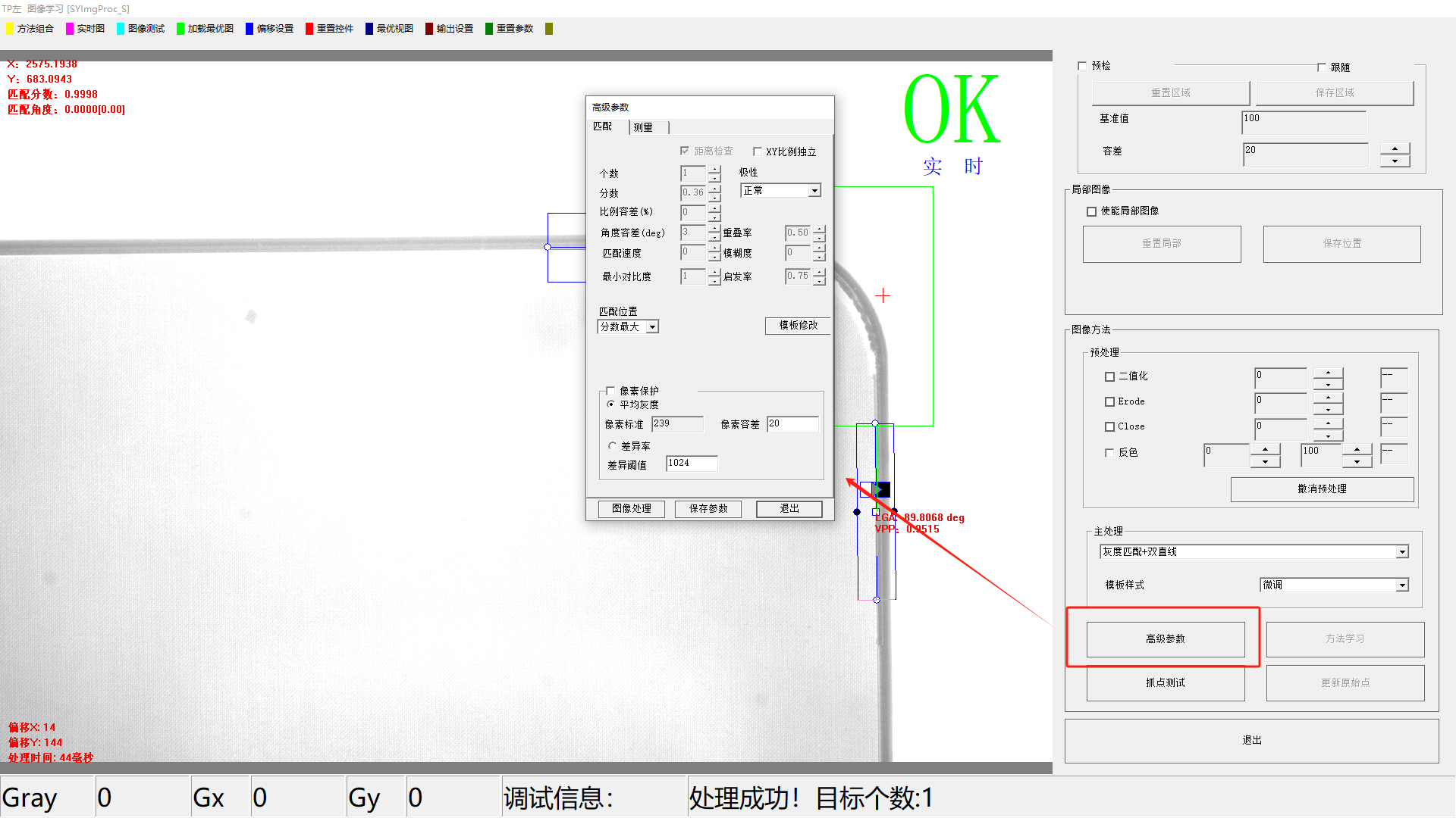 4、調(diào)整高級(jí)參數(shù)。點(diǎn)擊“高級(jí)參數(shù)”,進(jìn)入高級(jí)參數(shù)界面,調(diào)整參數(shù)可根據(jù)實(shí)際情況修改“分?jǐn)?shù)”、“個(gè)數(shù)”、“比例容差”、“角度容差”、“匹配速度”、“模糊度”等參數(shù)。