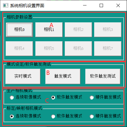 區(qū)域B: 相機(jī)模式切換,實(shí)時(shí)模式和觸發(fā)模式以及軟件觸發(fā)測(cè)試;軟件觸發(fā)測(cè)試中包換當(dāng)前相機(jī)的幀率以及丟幀情況;