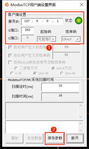 更改IP/端口、數(shù)據(jù)后需要點(diǎn)擊下面的“保存參數(shù)”后再進(jìn)行操作