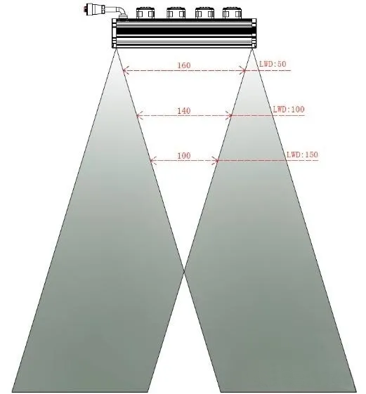 為了讓“縱向缺陷”也無(wú)處遁逃,可采用交叉線形光源。它可利用特殊的光學(xué)設(shè)計(jì),使兩側(cè)的光線呈一定角度匯集到光源中間位置,凸顯縱向缺陷,通過(guò)降低背景亮度來(lái)提升缺陷的對(duì)比度。