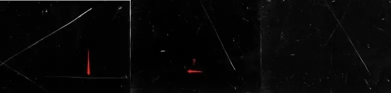 玻璃蓋板上的劃痕檢測(cè)結(jié)果如圖所示,分別是普通線光檢測(cè)“橫向劃痕”、普通線光檢測(cè)“縱向劃痕”、交叉線光檢測(cè)“縱向劃痕”,可以看出,使用普通線光源檢測(cè)“橫向劃痕”時(shí)缺陷可見(jiàn),使用普通線光源檢測(cè)“縱向劃痕”時(shí)缺陷不可見(jiàn),使用交叉線光源檢測(cè)“縱向劃痕”時(shí)缺陷可見(jiàn)。