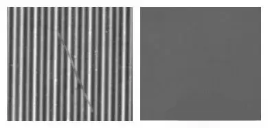 左側(cè)為平面條紋光源檢“劃痕”的效果,可以看到玻璃蓋板表面劃痕清晰可見(jiàn)。