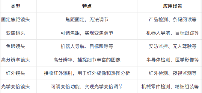 這個(gè)表格將不同類型的工業(yè)鏡頭按照特點(diǎn)和應(yīng)用場(chǎng)景進(jìn)行分類,方便了解各種鏡頭的區(qū)別和適用范圍。請(qǐng)注意,實(shí)際市場(chǎng)上還存在其他類型的工業(yè)鏡頭,這里列舉的是一些常見的類型。