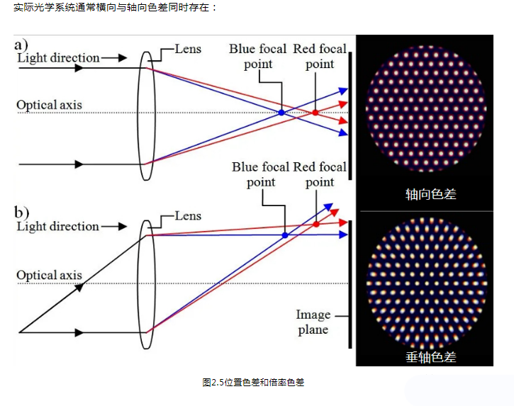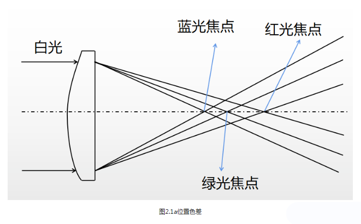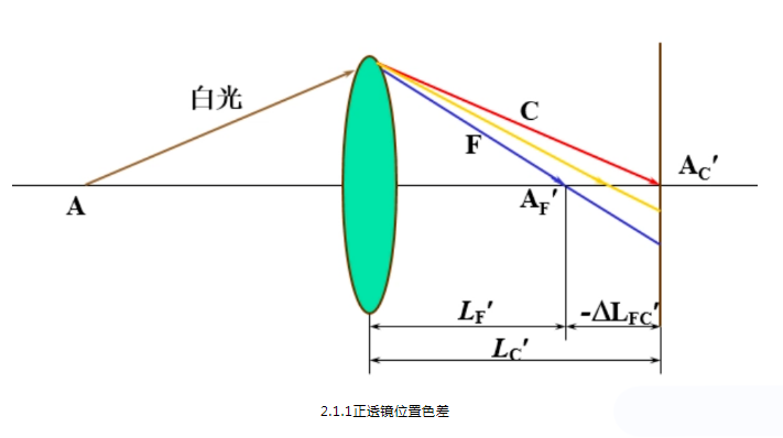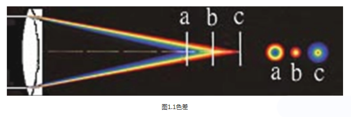 用白光進(jìn)行成像時(shí),除了每種單色光仍會產(chǎn)生五種單色色差外,還會因不同色光有不同折射率造成的色散,而使不同的色光有不同的傳播光路,從而呈現(xiàn)出因不同色光的光路差別而引起的像差,稱之為色像差(簡稱色差)。