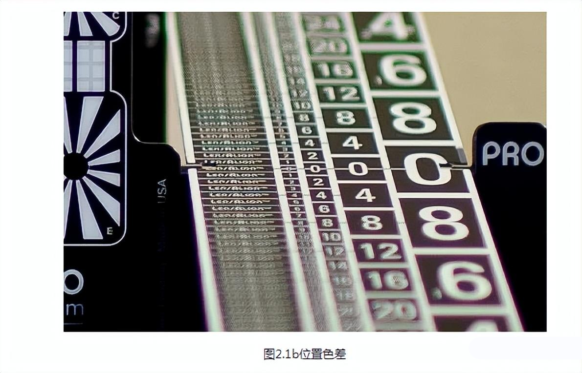 圖片上半部分出現(xiàn)了綠色色差,靠近相機(jī)的下半部分出現(xiàn)了紫色色差。