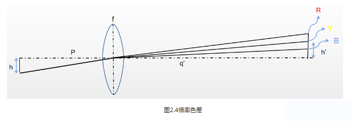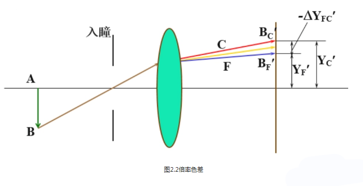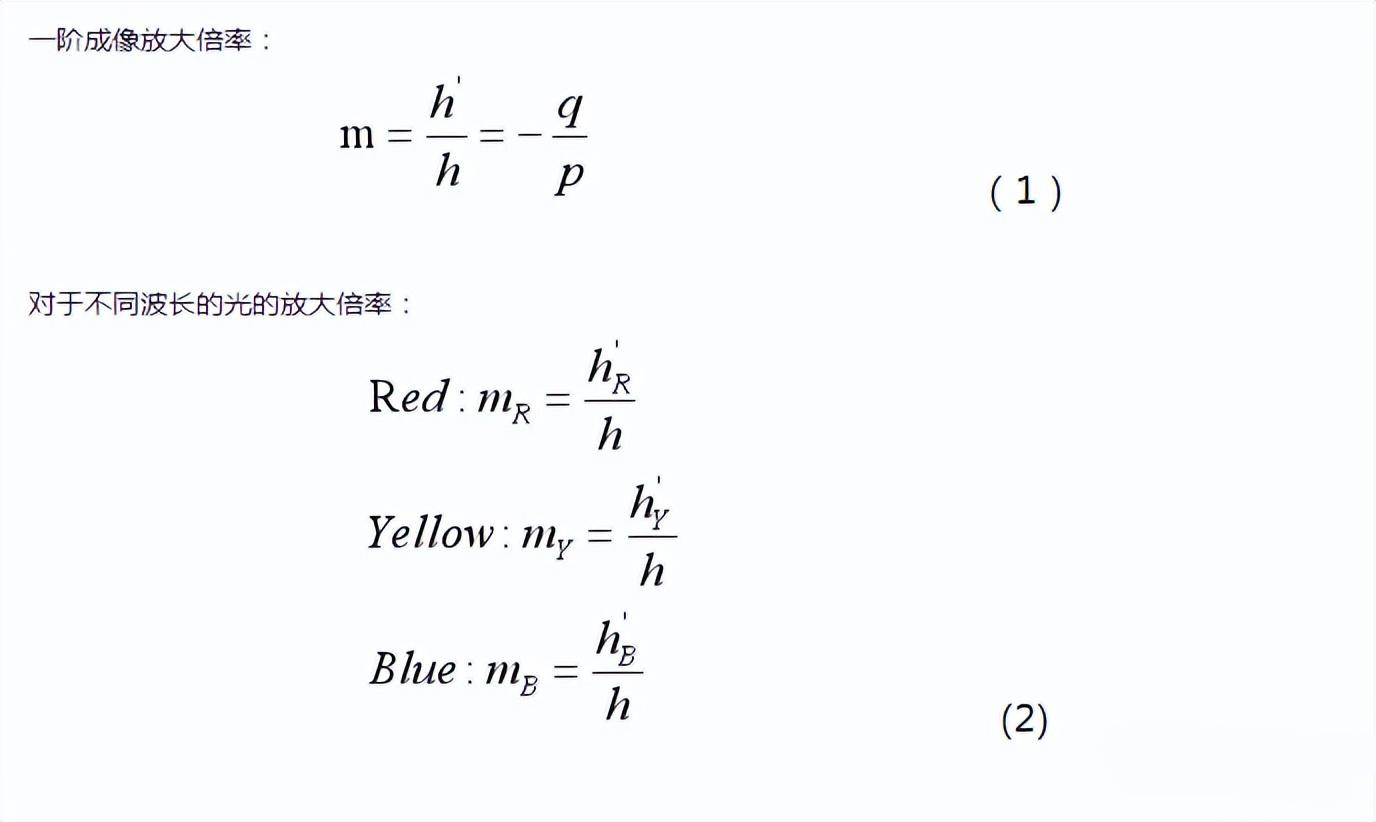 在倍率色差中,由于不同光線波長的折射率不同,導(dǎo)致像平面上不同顏色波長的光線產(chǎn)生橫向色散,即不同顏色有不同的放大倍率: