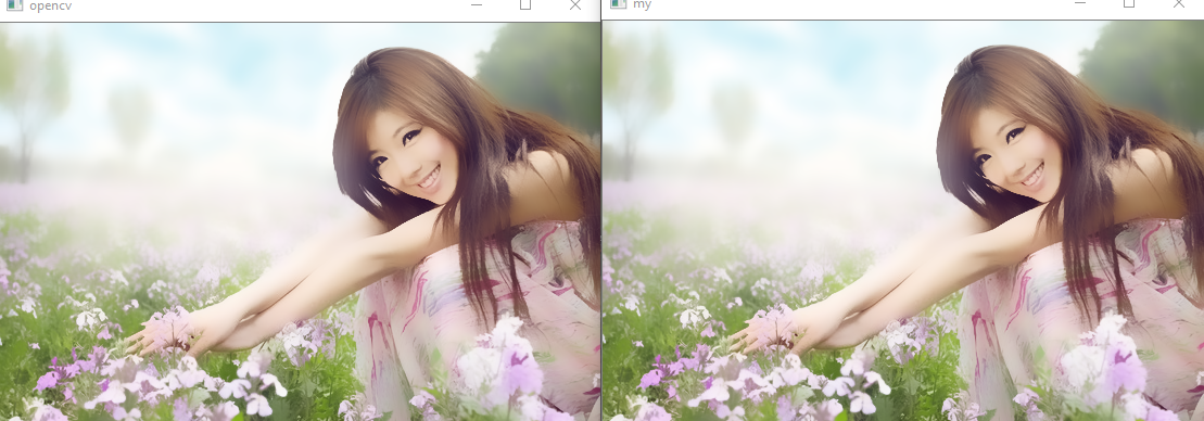 實現(xiàn)的結(jié)果和OpenCV的實現(xiàn)相差無幾。sigma = 80,模板大小為20
