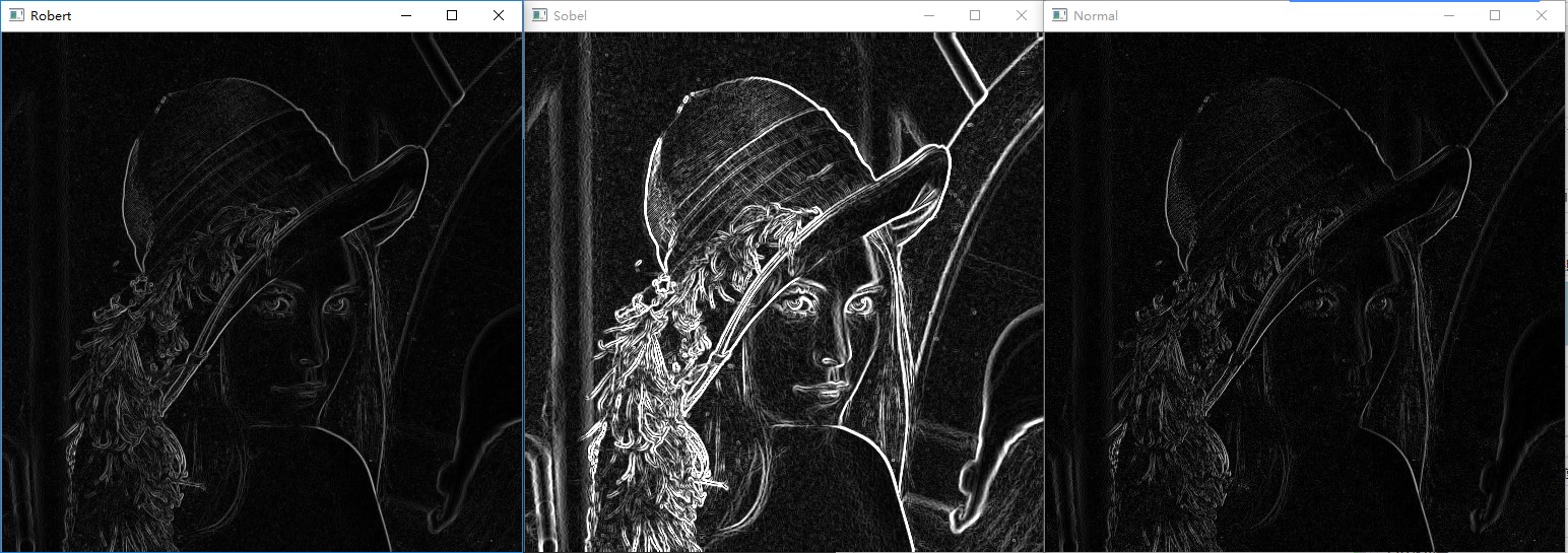 從上面結(jié)果可以看出,Robert交叉算子和基于定義得到的邊緣圖,得到的邊緣較細并且不是很連續(xù);Sobel得到邊緣較粗,線條連續(xù),效果明顯好于其他的兩種算子。