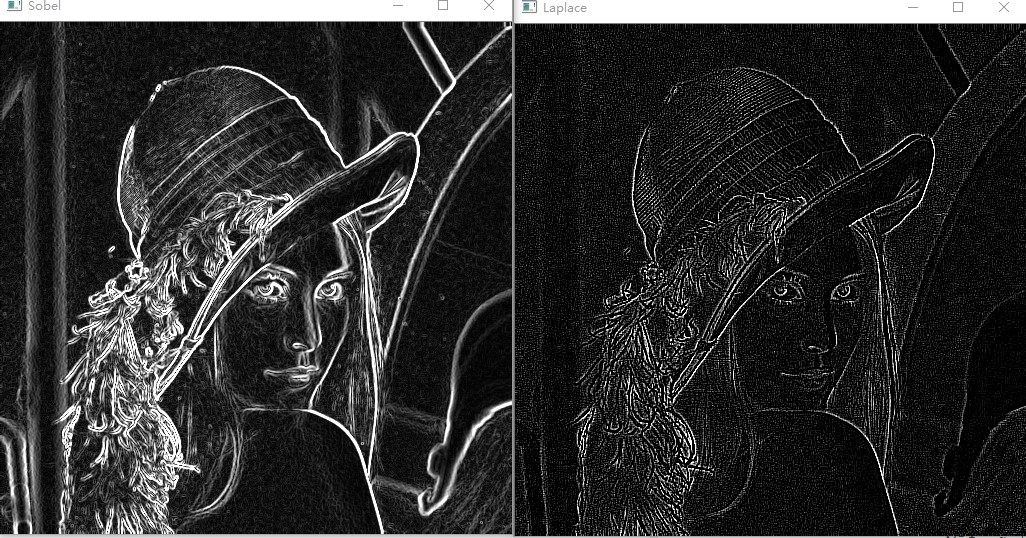 在OpenCV中有對LapLace的封裝,其函數(shù)為Laplacian,其使用的模板中心的系數(shù)為負,具體參數(shù)說明參見OpenCV文檔,其得到的邊緣圖和一階微分算子得到邊緣圖對比結(jié)果如下: