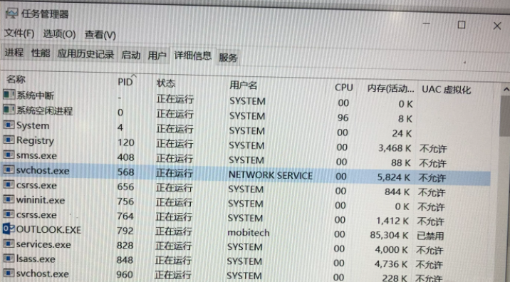 根據(jù)事件日志中給出來(lái)的信息,查找到名稱,狀態(tài),用戶名等更加詳細(xì)的信息。PID是568,對(duì)應(yīng)的是NETWORKSERVICE用戶,應(yīng)該是這個(gè)用戶的權(quán)限問(wèn)題。