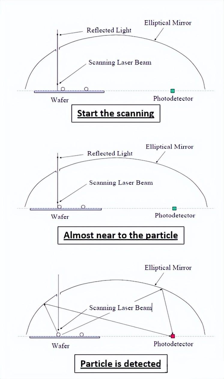 1)激光束在橢圓鏡的一個焦點處垂直掃描晶圓表面,光電探測器放置在另一焦點處;
