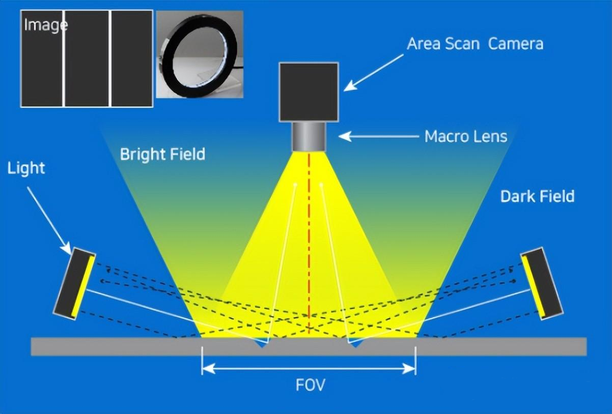 暗場法是一種使用散射光的測量方法。當光線照射到某個物體時,它會引起散射和反射,可以說它是一種利用這種散射光快速確定結(jié)構存在與否的方法。該結(jié)構在透鏡的視角(FOV)之外(主要在0~45度之間)安裝激光源,當光線照射時,散射光進入透鏡并識別物體。結(jié)構變亮,不存在的部分顯得很暗。當然,分辨率低于反射(Bright)類型,因為使用了散射光,但是可以快速拾取圖案邊緣的形狀,因此Fab里主要用暗場而不是明場。暗場中使用的光源使用波長比亮波長長的紫外線。