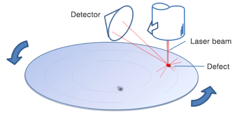 由于沒有圖案,因此無需圖像比較即可直接檢測(cè)缺陷。激光束投射到旋轉(zhuǎn)晶圓上,并沿徑向移動(dòng),以便激光束能夠照射晶圓的整個(gè)表面。