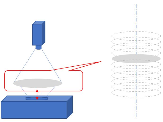 這種對焦方式更準確的描述應(yīng)當為尋焦。由于對焦方向未知,晶圓在相機焦距附近以一定速度運動的同時,相機持續(xù)拍攝連續(xù)的圖像(類似于核磁共振切片)。上位機在找到最清晰圖像后指令晶圓運動到相應(yīng)位置(如圖1)。這種對焦方式對運動平臺的最小步進和重復(fù)定位精度有著一定的要求。但由于尋焦的工藝特性,其產(chǎn)率往往不高。