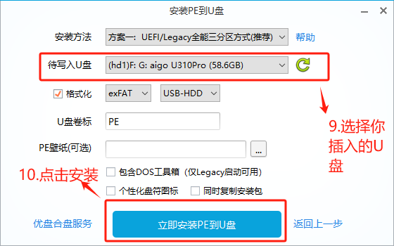 選擇右下角的“安裝PE到U盤”,在安裝前先將U盤插到電腦的usb接口上