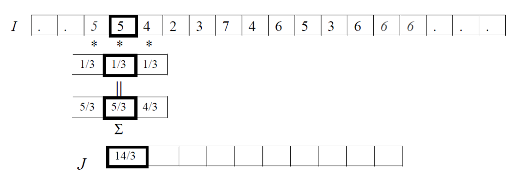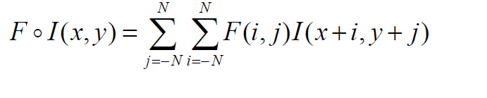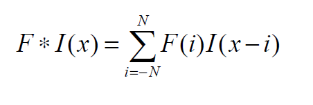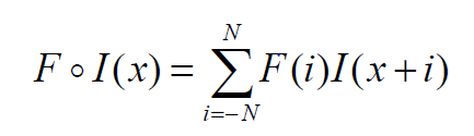 如下公式給出了使用濾波器 F 對(duì)輸入數(shù)據(jù) I 進(jìn)行一維相關(guān)運(yùn)算的數(shù)學(xué)公式。我們假設(shè) F 有奇數(shù)個(gè)元素,所以當(dāng)它移動(dòng)時(shí),它的中心就在圖像 I 的一個(gè)元素上。所以我們說(shuō) F 有2N+1個(gè)元素,這些元素從-N索引到N,所以F的中心元素是F(0)。