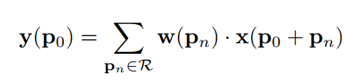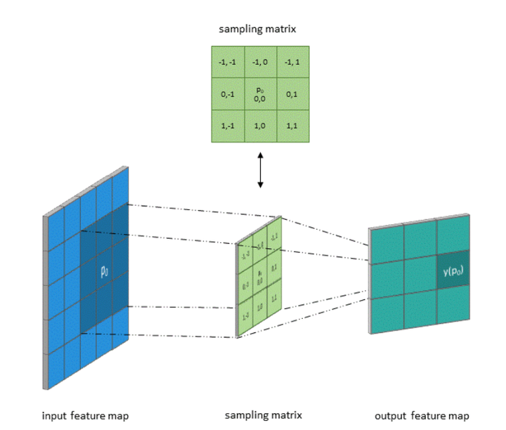 可變形卷積學(xué)習(xí)是具有位置偏移的采樣矩陣,而不像標(biāo)準(zhǔn)卷積那樣使用固定偏移的采樣矩陣。偏移量通過(guò)附加的卷積層從前面的特征映射中學(xué)習(xí)。如果將標(biāo)準(zhǔn)卷積表示為:
