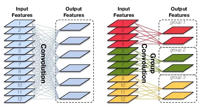 假設(shè)輸入featuremap的尺寸仍為C?H?W,輸出feature map的數(shù)量為N個(gè),如果設(shè)定要分成G個(gè)groups,則每組的輸入feature map數(shù)量為C/G,每組的輸出feature map數(shù)量為N/G,每個(gè)卷積核的尺寸為C/G?K?K,卷積核的總數(shù)仍為N個(gè),每組的卷積核數(shù)量為N/G,卷積核只與其同組的輸入feature map進(jìn)行卷積,卷積核的總參數(shù)量為N?C/G?K?K,可見(jiàn),總參數(shù)量減少為原來(lái)的1/G。其連接方式如下圖右所示,group1輸出map數(shù)為2,有2個(gè)卷積核,每個(gè)卷積核的channel數(shù)為4,與group1的輸入map的channel數(shù)相同,卷積核只與同組的輸入map卷積,而不與其他組的輸入map卷積。