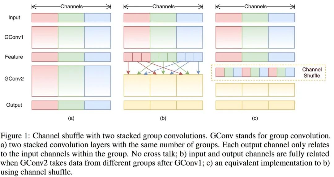 Shuffled GroupedConvolutions 是在 Groupconvolution 計(jì)算后對(duì)輸出的 output feature maps 進(jìn)行shuffle(打亂)處理,以使得接下來(lái)的Group convolutionfilters可在每個(gè)group所輸出的部分channels構(gòu)成的集合上進(jìn)行計(jì)算。其操作如下圖所示,這么做的原因是為了有效地減小Groups convolution使用導(dǎo)致的Groups間特征互不相通的負(fù)面影響。