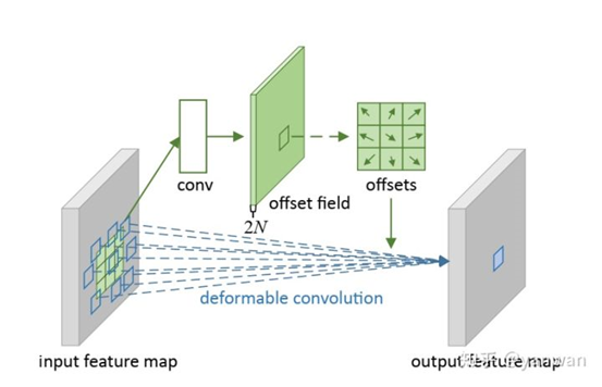 如下所示,偏移量通過(guò)在輸入特征映射上應(yīng)用卷積層來(lái)獲得。假設(shè)原來(lái)的卷積操作是3*3的,那么為了學(xué)習(xí)offsets,需要定義另外一個(gè)3*3的卷積層,輸出的offset field其實(shí)就是原來(lái)feature map大小,channel數(shù)等于2N(分別表示x,y方向的偏移,這里的N實(shí)際上是 kernel 里的 samplinglocation數(shù)。如果 3 x 3 的 kernel 的話,N = 9)。這樣的話,有了輸入的feature map,有了和feature map一樣大小的offset field,我們就可以進(jìn)行deformable卷積運(yùn)算。所有的參數(shù)都可以通過(guò)反向傳播學(xué)習(xí)得到。