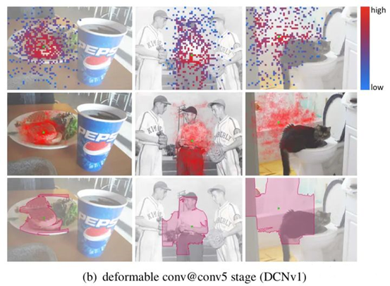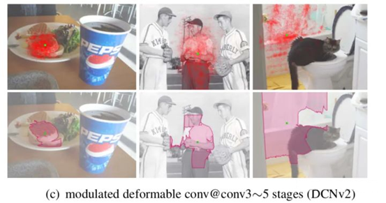 DCN v1的問(wèn)題是:可變形卷積有可能引入了無(wú)用的區(qū)域來(lái)干擾我們的特征提取,降低了算法的表現(xiàn),如下圖所示。