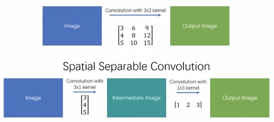 通過(guò)這種方式,原本一次卷積要算9次乘法,現(xiàn)在只需要6次。但是SpatiallySeparableConvolutions 有一個(gè)缺陷那就是并不是所有卷積核可以分成兩個(gè)小的卷積核。